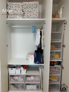 最後に、導線を考えて収納してもらい、すっきり片付いただけでなく、日常の無駄な動きも減って、時間の節約にもなっています。